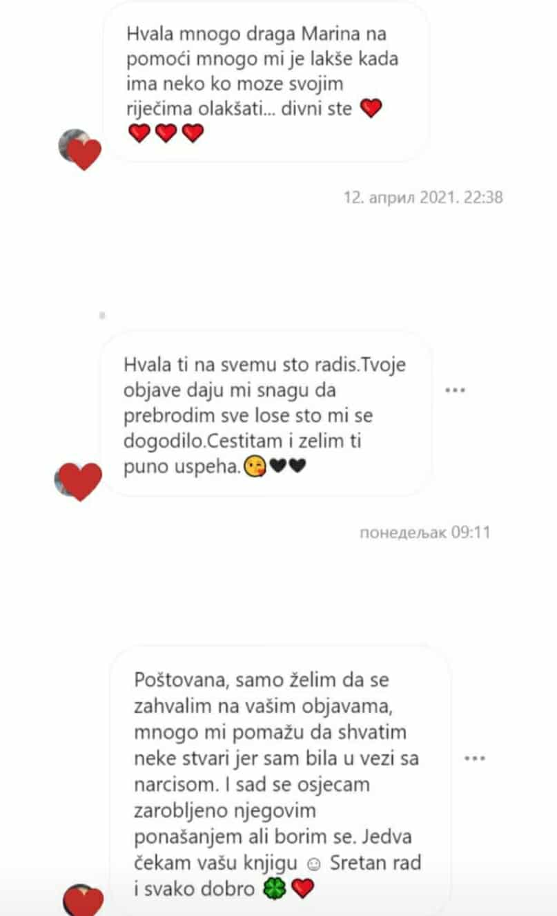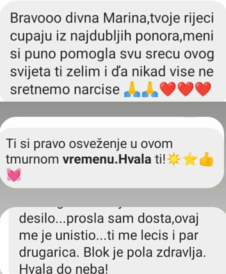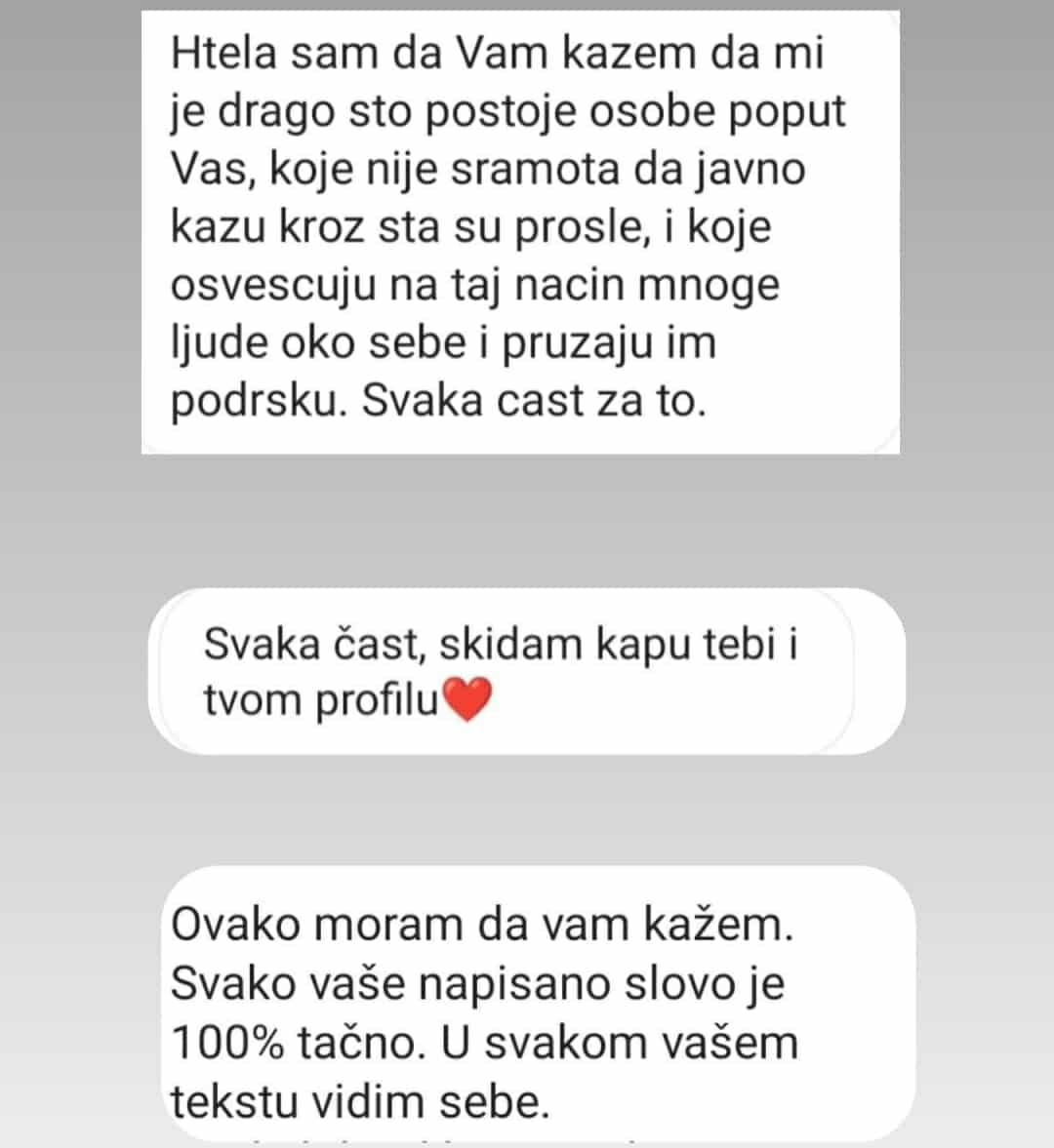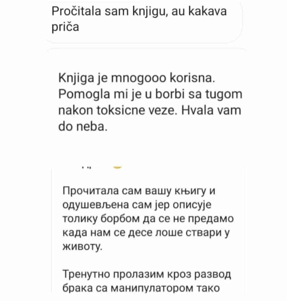 Nisam samo neko ko iznosi knjiška znanja. I sama sam prošla kroz sva ta ista bolna iskustva kao i ti. Odrastala sam u toksičnoj porodici. Bila sam zarobljena u kavezu sa narcisom i znam koliko boli kad ti režu krila. Iskusila sam gorčinu veza sa psihopatom i sa emotivno nedostupnim partnerima. Nisam savršena Instagramuša. Savršeno i ne postoji.